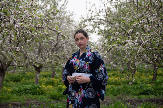 את הרעיון ליום הצילום הרביעי היה לי כבר כשחשבתי על הנושא שלי לפרויקט, עוד לפני שצילמתי את את הפרזנטציה הראשונה. בחרתי בספל מיפן, שבו מצוירות נשים יפניות לבושות בקימונו, שותות תה בפריחת הדובדבן. לכן, ברחתי לצלם מישהי לבושה בקימונו, בפריחת השקדיות. רציתי לדמות כמה שיותר את הספל ולכן ברחתי לצלם בפריחת השקדיות שדומה לפריחת הדובדבן. השאלתי קימונו מחברה, ונסעתי למושב היוגב לצלם.